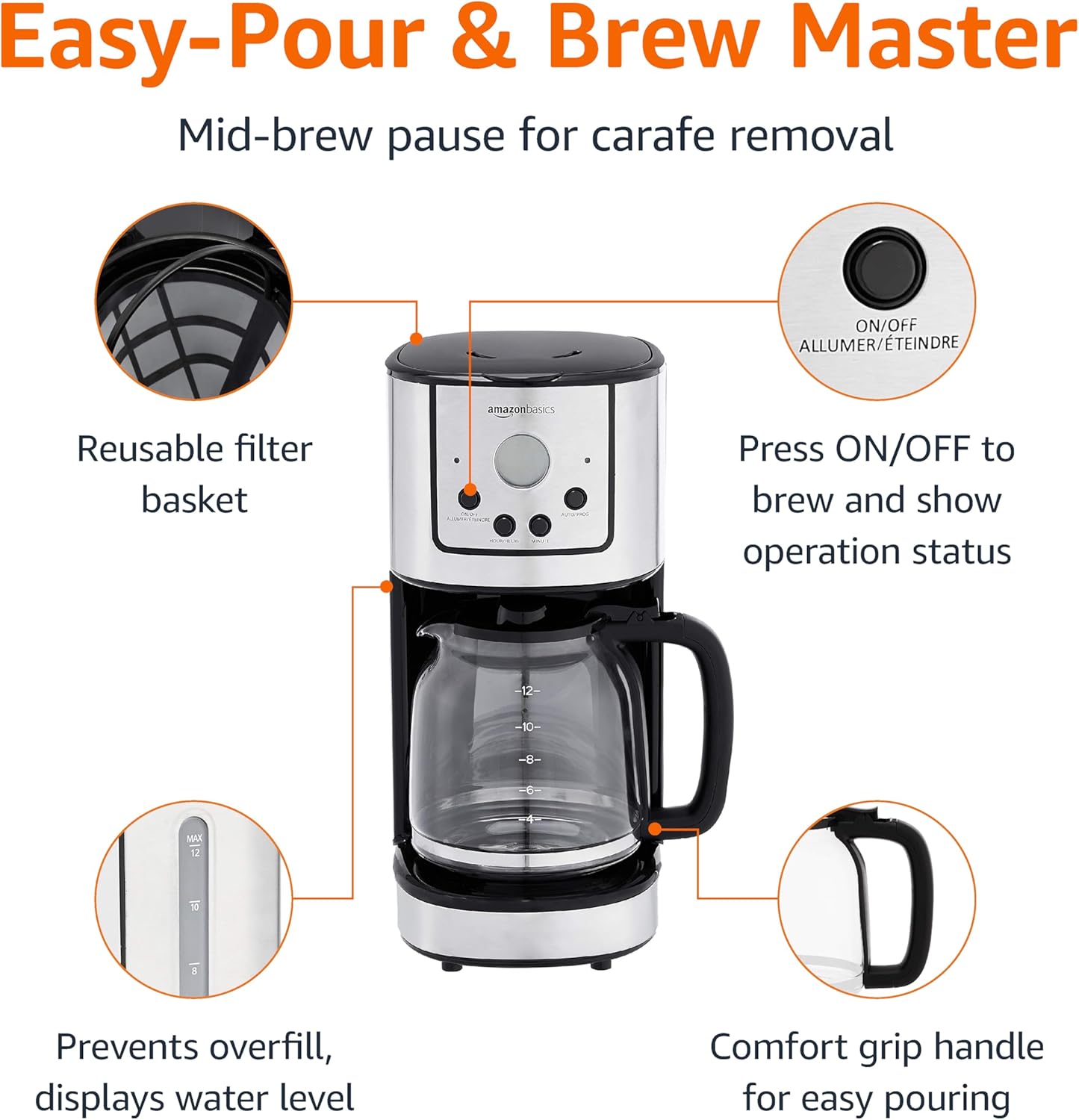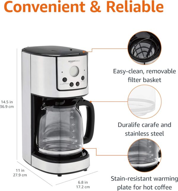 Amazon Basics Programmable Coffeemaker with Carafe and Reusable Filter, Stainless Steel, 12 Cups