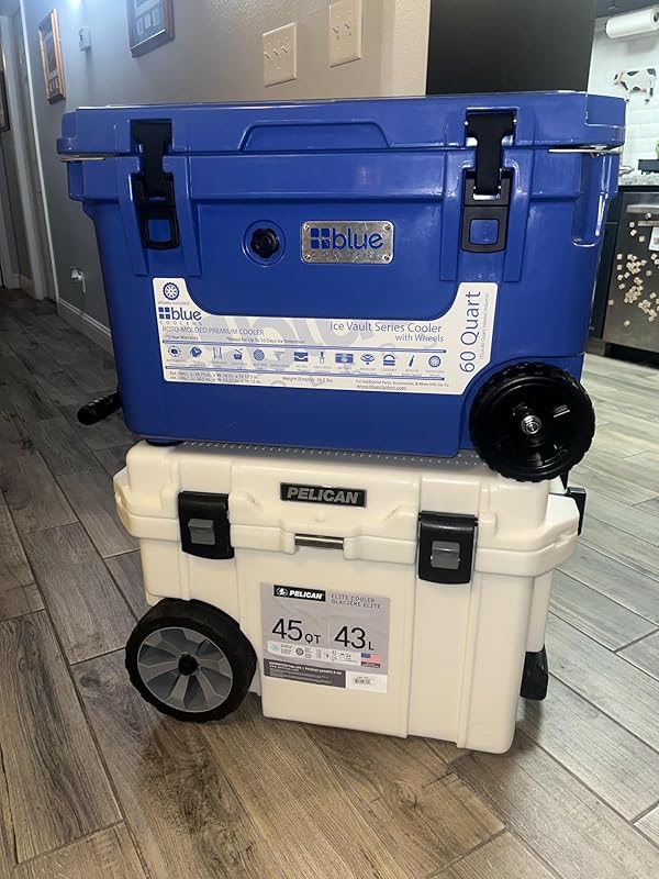 Against the recommendations of others, I decided to buy and keep the Blue Cooler 60w instead of the Pelican 45qt Wheeled Cooler.I was looking to purchase a cooler for multi-day solo and couple’s camping and purchased both units on Amazon for Memorial Day.Both coolers were dimensionally the same size, but the Blue Cooler holds 15 quarts more space than the Pelican.Blue Cooler Pros: The Blue Cooler 60w is Roto-molded and rated to hold ice for 10 days. [I conducted my own ice retention test in my rear-shaded patio for nine days in 100-degree weather]. The latches, rubber seal, and pull-handle are thicker, reliable, and more durable than the Pelican’s. The Blue nameplate is riveted to the body of the cooler and will never come off, and the corners of the lip are reinforced with stainless steel edges. The pull handle is heavy-duty metal with rubber bicycle-type handle grips. The cooler is easy to pull and maneuver. The price– $319 (vs $372). The Blue’s skin is thick and commensurate with Pelican’s.Pelican Cons: Pelican latches are made of chinsy-plastic that often break (which explains why every used Pelican for sale on FB marketplace has broken latches) Albeit, Pelican units have a lifetime warranty, they are too cumbersome to submit for warranty replacement and wait for the parts to arrive in the mail to replace the part yourself. The Pelican brand name stickers on the cooler easily peel off and were delaminating straight out of the box upon delivery. The pull handle on the Pelican is a joke, and the handle is made of the same hallowed-plastic that children’s toys are made of. There is also this weird block design that pivots and pushes on the cooler plastic rolling to cooler around, which I don’t see as a long-term solution for portability and movement. Price– $372 (vs $319). When I tested this unit against the Blue Cool for ice retention, the Pelican was only able to hold ice for three days.Pelican Pros: The two things that the Pelican cooler has over the Blue Cooler 60w [that I found] were the larger wheels and the retention wire on the drain plug. That’s it. I guess, if you are pulling your cooler down a dirt trail over rocks and ruts, and you are worried about losing the plug– those are benefits.I returned the Pelican and kept the Blue cooler– which was clearly the smart choice.