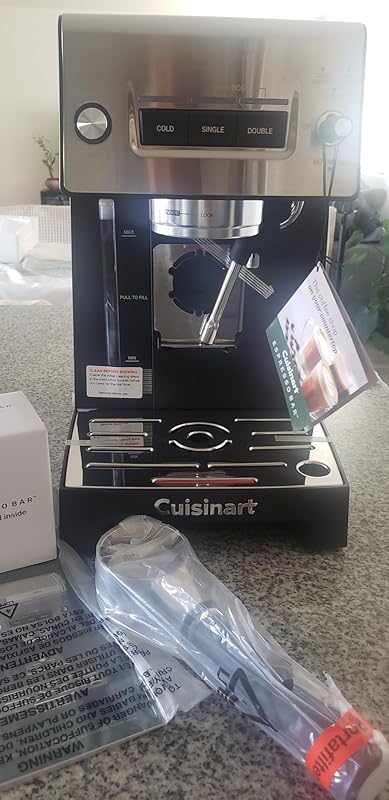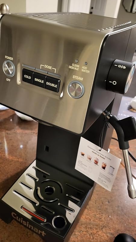 I received the Cuisinart Espresso Bar Grind & Brew Espresso Machine through the Amazon Vine program in exchange for an honest review — and I have to say, this machine has exceeded my expectations. If you’re serious about your coffee and want the convenience of fresh-ground espresso at home without the complexity of a professional setup, this unit strikes a great balance.Right out of the box, you can tell this is a well-constructed machine. It has a sturdy, premium feel with a brushed stainless finish that looks great on the counter. Important note: this is a heavy appliance, and I strongly recommend having two people unpack and move it into place. It’s not something you want to unbox alone if you can avoid it.The footprint is reasonable for a unit that combines a grinder, brewer, and milk frother, and it feels more compact than some of the high-end competitors.The integrated burr grinder delivers consistent, quality grinds — not too loud, and a noticeable upgrade in flavor compared to pre-ground coffee. Adjusting the coarseness is simple, and using fresh beans makes a dramatic difference in aroma and taste.Brewing is quick and satisfying. I consistently get a good layer of crema, and the pressure system seems solid. It allows for single or double shots, and switching to steam is quick and intuitive.The steam wand works well for a home setup. While it takes a little practice to master microfoam, it adds a professional touch to drinks. The wand has decent power and is easy to clean.Daily cleaning is manageable. The drip tray, grounds bin, and water tank are easy to remove and rinse. It also has a rinse function, which helps keep things tidy after each use.Watching a YouTube video or two made a big difference for me. The included instructions are fine, but seeing the process visually helped shorten the learning curve — especially with dialing in the grind size and using the steam wand effectively.This is a serious upgrade for anyone looking to move beyond pods or basic coffee makers. It delivers high-quality espresso, lattes, and cappuccinos with ease and convenience. If you want café-style coffee at home with the rich flavor only fresh beans can deliver, this machine is an excellent choice. Just be prepared for the weight — it’s a solid piece of equipment, and worth every pound.