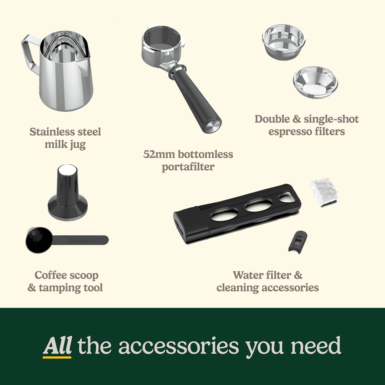 Let’s start with looks! This espresso machine is absolutely beautiful, looks fantastic sitting on my island. It’s not one of those huge bulky machines but it’s also not compact, it’s a nice medium size that would fit just fine in a smaller kitchen but still stand out in a large chef’s kitchen.Setup was simple enough and it makes a nice well rounded espresso without any fuss. What I like most is all the many accessories it includes: stainless steel milk jug, storage tray, steam wand cleaning pin, tamping tool, water filter, charcoal filter, single shot espresso filter, double shot espresso filter, 52mm bottomless portafilter and a coffee scoop. The only accessory you’ll need to buy if you don’t already have one and want to use whole beans is a coffee grinder. My favorite is the cold extraction feature as I really like to enjoy iced coffees during the hotter months. All around excellent espresso machine. Highly recommend!