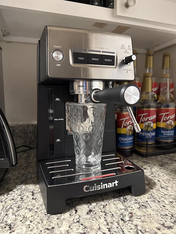 I received the Cuisinart Espresso Bar Grind & Brew Espresso Machine through the Amazon Vine program in exchange for an honest review — and I have to say, this machine has exceeded my expectations. If you’re serious about your coffee and want the convenience of fresh-ground espresso at home without the complexity of a professional setup, this unit strikes a great balance.Right out of the box, you can tell this is a well-constructed machine. It has a sturdy, premium feel with a brushed stainless finish that looks great on the counter. Important note: this is a heavy appliance, and I strongly recommend having two people unpack and move it into place. It’s not something you want to unbox alone if you can avoid it.The footprint is reasonable for a unit that combines a grinder, brewer, and milk frother, and it feels more compact than some of the high-end competitors.The integrated burr grinder delivers consistent, quality grinds — not too loud, and a noticeable upgrade in flavor compared to pre-ground coffee. Adjusting the coarseness is simple, and using fresh beans makes a dramatic difference in aroma and taste.Brewing is quick and satisfying. I consistently get a good layer of crema, and the pressure system seems solid. It allows for single or double shots, and switching to steam is quick and intuitive.The steam wand works well for a home setup. While it takes a little practice to master microfoam, it adds a professional touch to drinks. The wand has decent power and is easy to clean.Daily cleaning is manageable. The drip tray, grounds bin, and water tank are easy to remove and rinse. It also has a rinse function, which helps keep things tidy after each use.Watching a YouTube video or two made a big difference for me. The included instructions are fine, but seeing the process visually helped shorten the learning curve — especially with dialing in the grind size and using the steam wand effectively.This is a serious upgrade for anyone looking to move beyond pods or basic coffee makers. It delivers high-quality espresso, lattes, and cappuccinos with ease and convenience. If you want café-style coffee at home with the rich flavor only fresh beans can deliver, this machine is an excellent choice. Just be prepared for the weight — it’s a solid piece of equipment, and worth every pound.