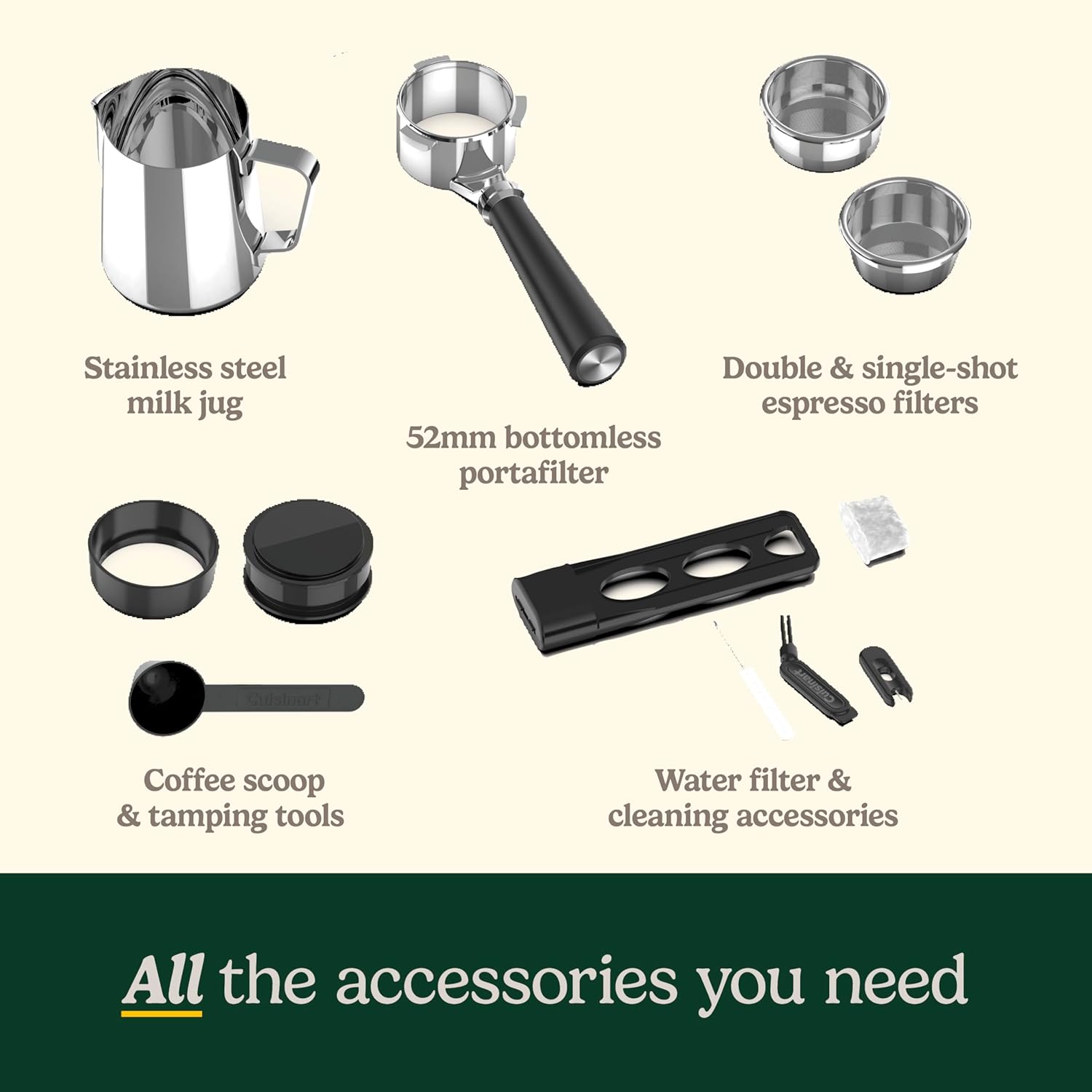 | Included Accessories | Milk jug, single & double shot filters, tamping puck, dosing guide, cleaning brush, wand cleaning pin |