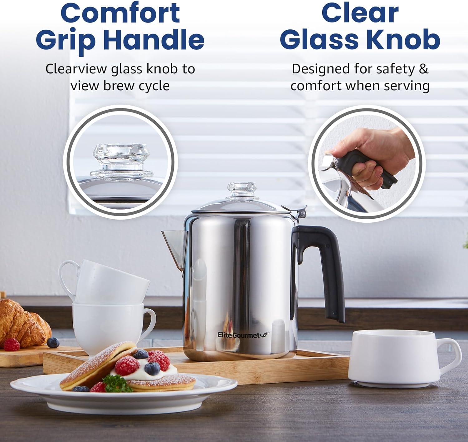 Clear Glass Brew Knob: Allows you to monitor when percolation begins, for precision brewing.