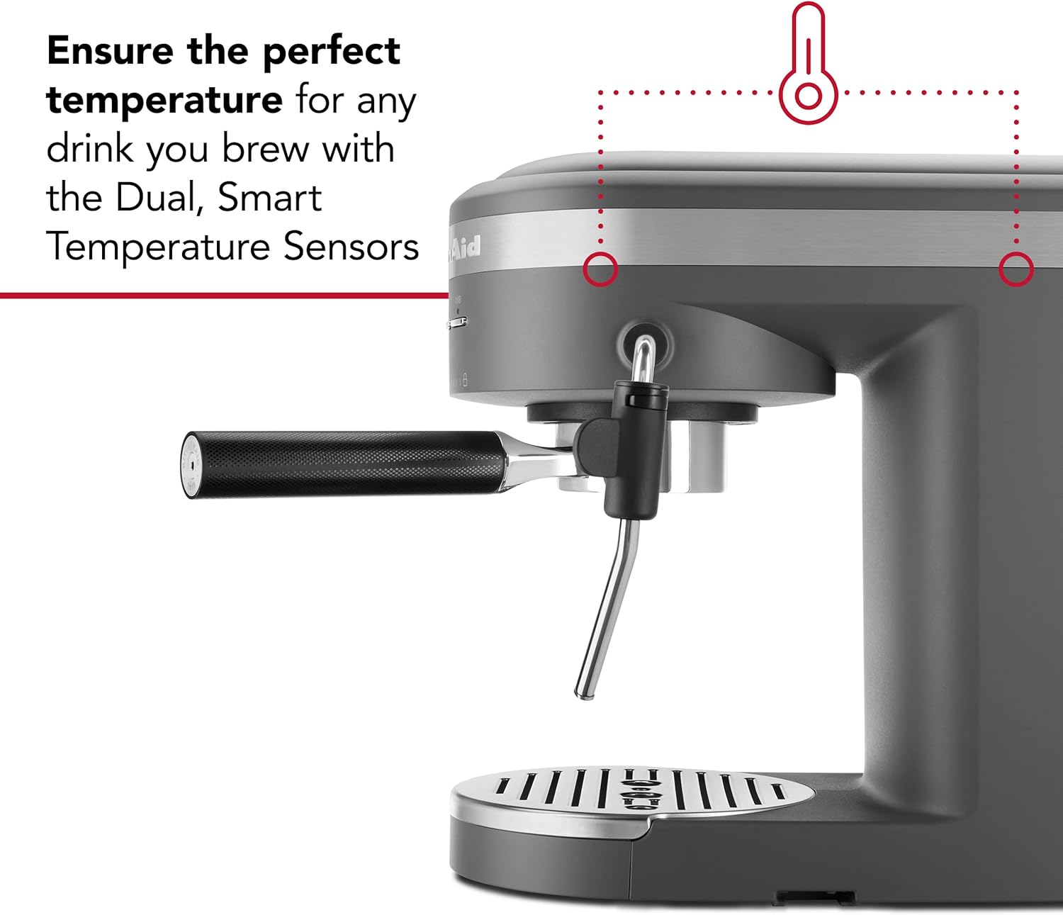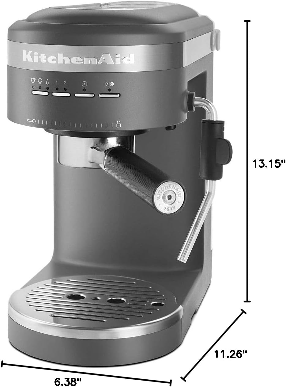 The KitchenAid Semi-Automatic Espresso Machine is a thoughtfully engineered semi-automatic espresso machine built for coffee lovers who appreciate quality, control, and design. With dual smart temperature sensors, a commercial-style 58mm portafilter, and a powerful 15-bar Italian pump, it delivers consistently rich espresso shots at the ideal temperature. The compact footprint and stylish matte Charcoal Grey finish make it an elegant fit for any kitchen.