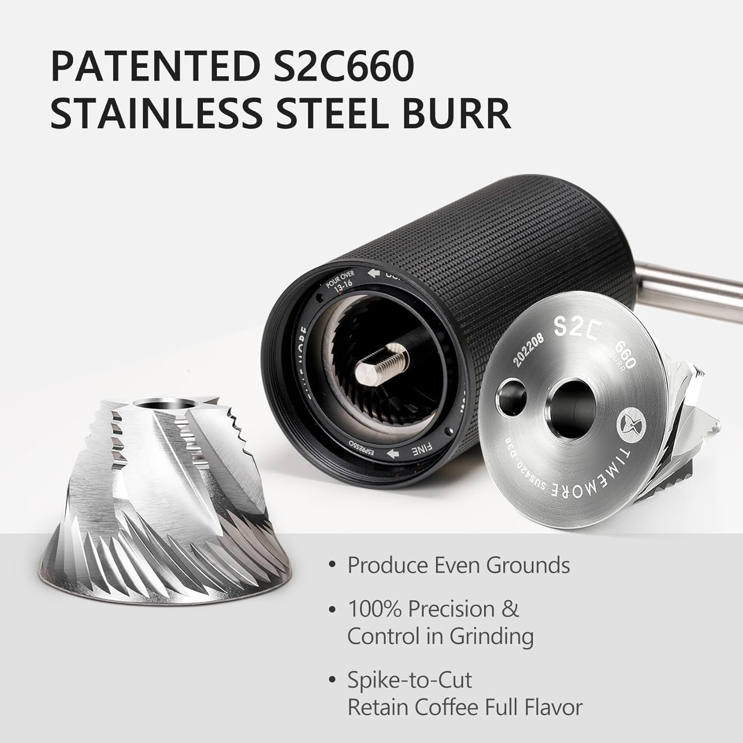 • S2C Hexagonal Conical Burrs: Patented stainless steel burrs with a 5-axis CNC process ensure a uniform grind with minimal fines, preserving the delicate flavors of your coffee.