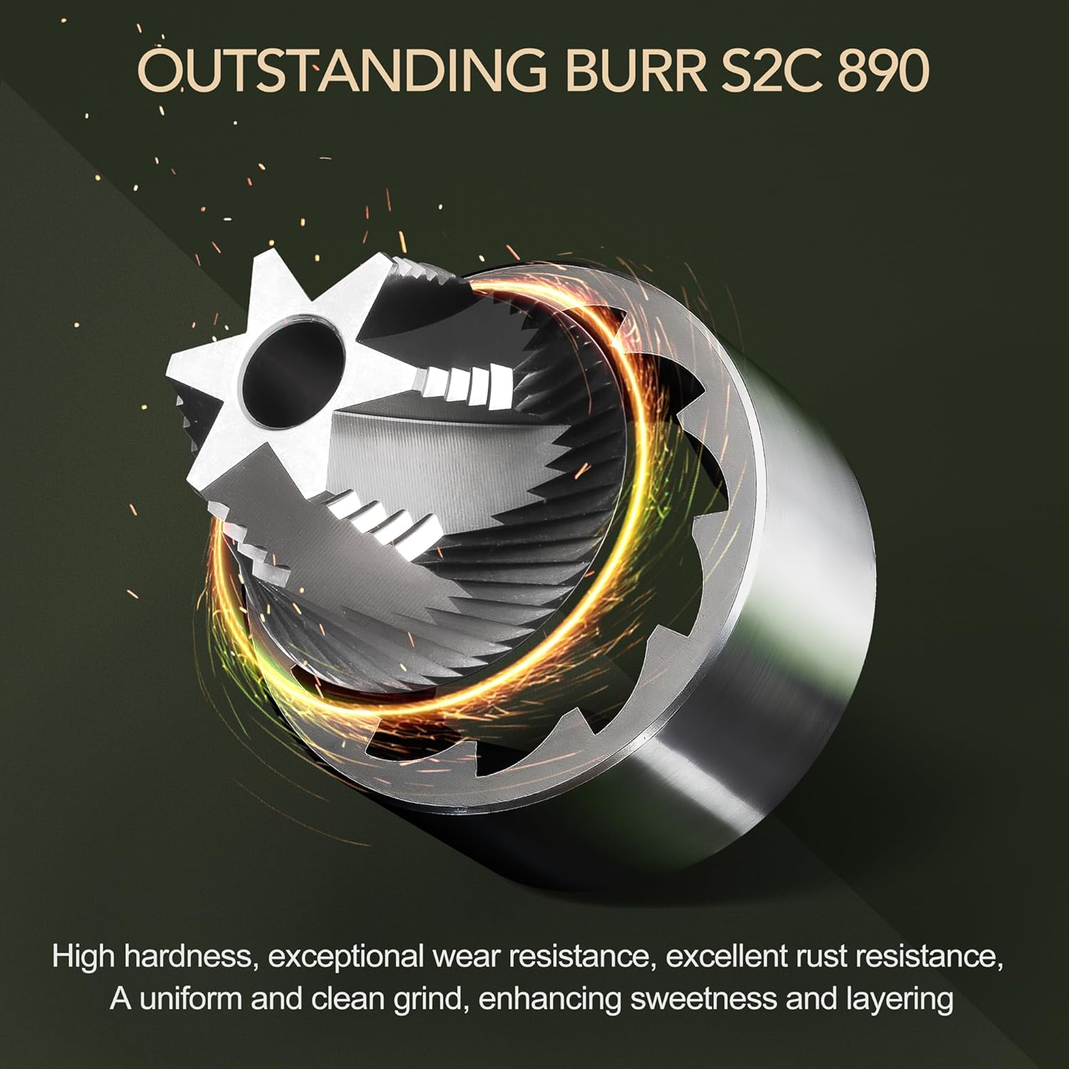 • 🔩 Patented S2C 890 Stainless Steel Burrs: Ensure consistent grind size, reduced retention, and long-lasting durability.
