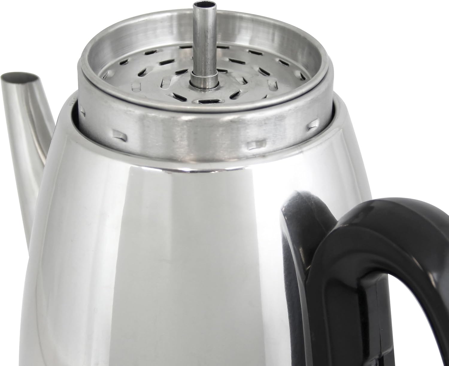 After our last ‘modern’ brewer became possessed – the grinder (which hadn’t worked at all in quite a while) on the stupid thing would start up on its own – I decided to go back to a good old reliable percolator. After much thought, I decided on this one. Glad I did! This is a very nice percolator and it does everything I expected. I also love the fact that it doesn’t take up half my counter space like the fancy new drip machines that don’t last long anymore. I read all the reviews and took some advice from other reviewers (like making sure the basket is wet before putting the filter in, especially if using finer (drip grind) ground coffee – genius!) I’m using regular basket filters … just take a little stack, fold in half, make a snip; fold in half the other way, make another snip; now you have a filter with a ‘hole’ in it to fit over the stem in the basket. A couple of reviewers said they have had problems with coffee dripping from the clear knob on the top. (The clear knob is plastic, by the way … but what else can you expect in today’s throw-away world?) Mine has had maybe one drip on a couple of occasions, but no big deal. I just make sure the lid is securely fitted onto the pot and haven’t had a problem since. Since this percolator does not come with a timer on it, I plug it into an outlet timer, and taa-daa! Freshly brewed coffee when I wake up! It smells wonderful as it brews and I can’t help it, I love the percolating sound and watching it perk (fond childhood memories). The coffee is HOT and tastes so much fresher than drip. It stays hot until it shuts off (if empty) or you unplug it – without that hot plate burned taste to it (and I’ve left it on for 3-4 hours…). There are only 2 negative things I can say about this pot: 1- it seems kind of loud, but you get used to it pretty quickly, and I rather expected it for this kind of brewing process; and 2 – unless you grind your own beans (or can grind them at the store), it is difficult to find “percolator grind” coffee, which is coarser than drip grind. But the grind is not the percolator’s fault! If using a drip grind, make sure you use a filter! I have made both grinds with and without filters and there will be a little bit of grind residue without a filter with the percolator grind. Drip grind without a filter leaves a LOT of grounds residue … but it’s no big deal to me, I just close my eyes, enjoy the aroma and taste, look out at all my trees and remember the good old days of camping and coffee by the fire 🙂 Overall, I’m very happy with the purchase and would buy it again.